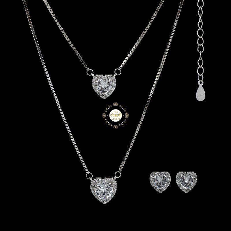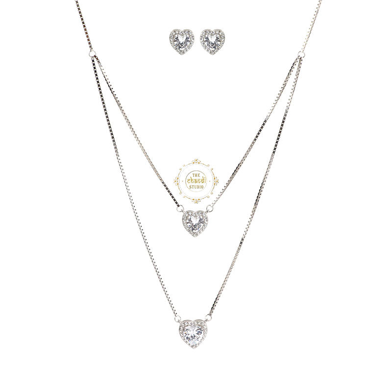 Sparkling Silver Heart Double Layered Necklace with Earring