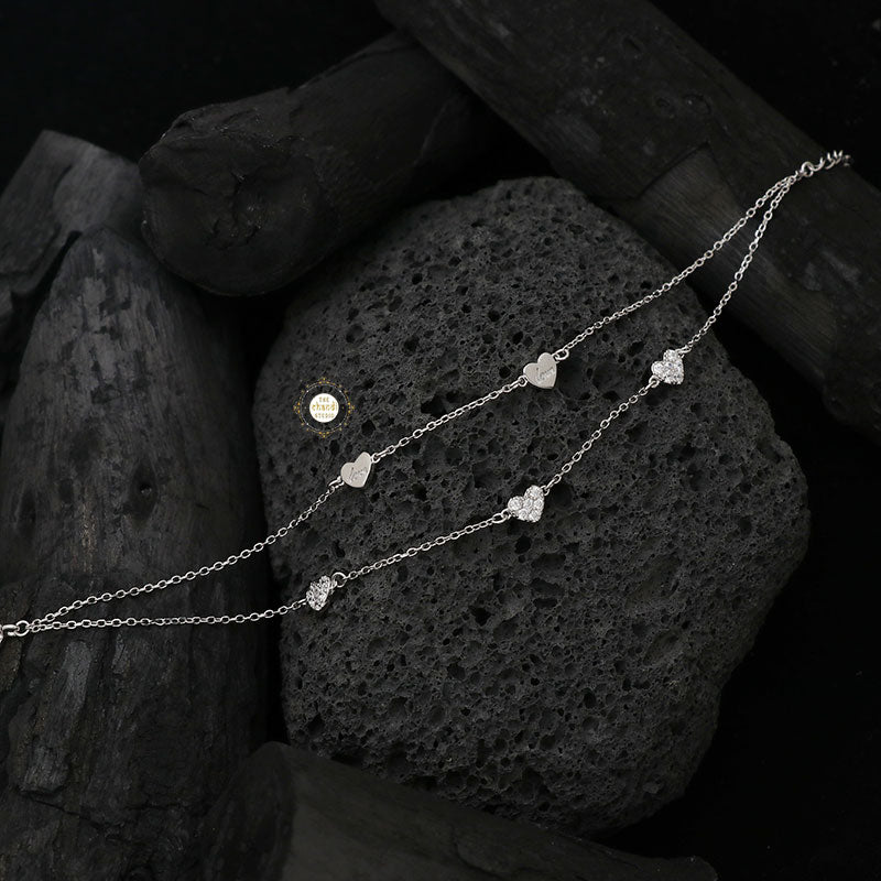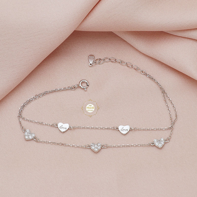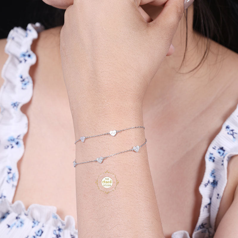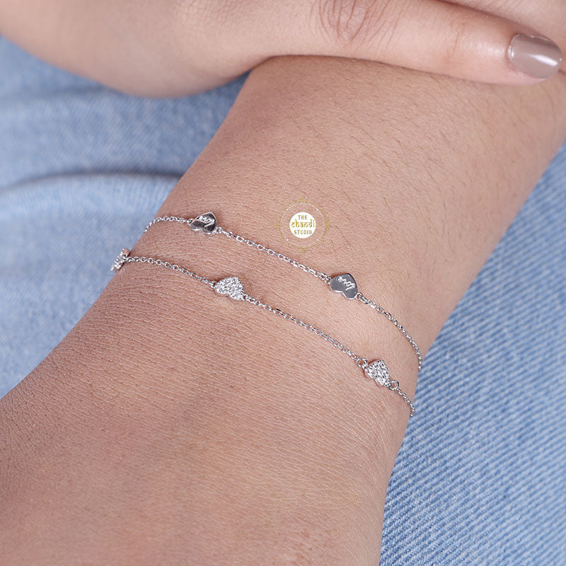 Introducing our Sparkling Silver Heart Bracelet, a symbol of love and elegance in our blingy silver jewellery collection. Crafted with precision and adorned with sparkling zircon, this bracelet shines with a timeless beauty. The heart-shaped design adds a romantic touch, making it a perfect accessory for any special occasion or everyday wear. * SIZE ADJUSTABLE * Nickle free Rhodium Polish for better finish