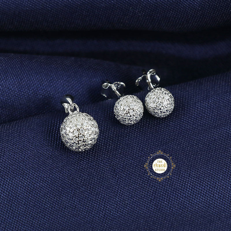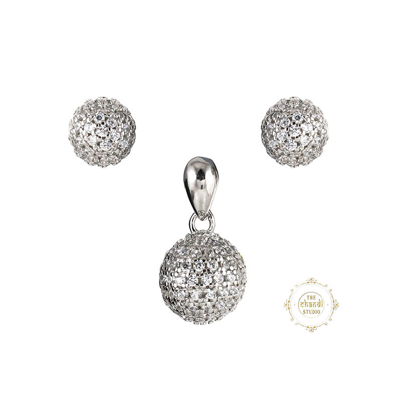 Elevate your elegance with the Sparkling Starlit Sphere Pendent Set Featuring dazzling stones and a timeless design, this silver set adds a touch of luxury to every look.
