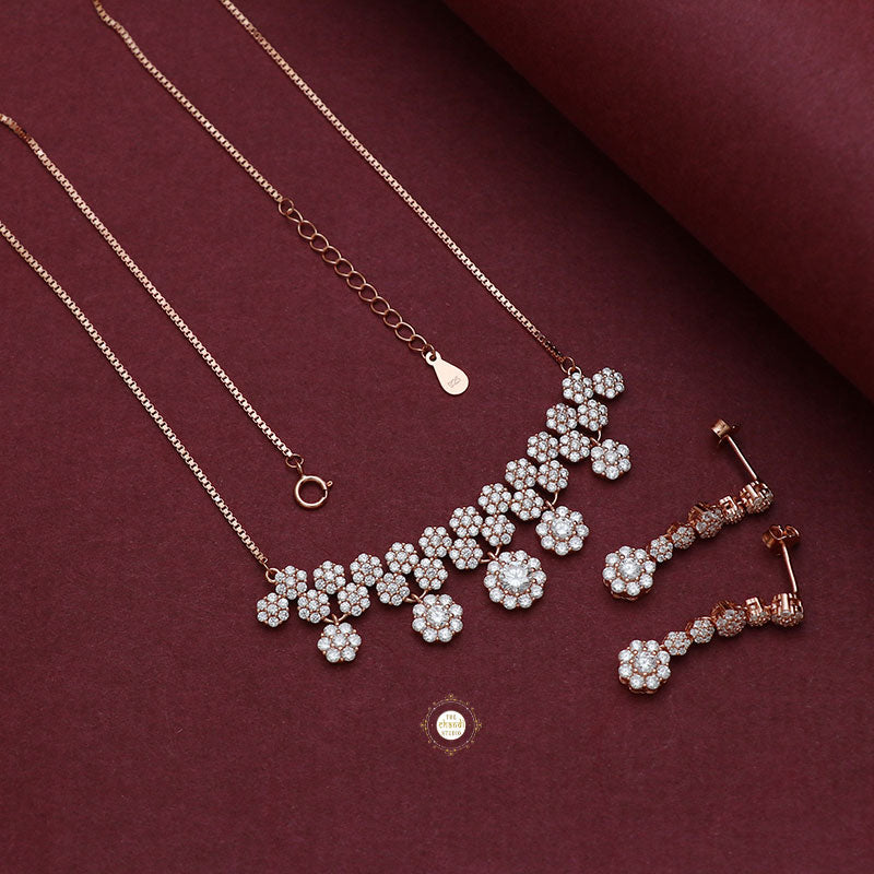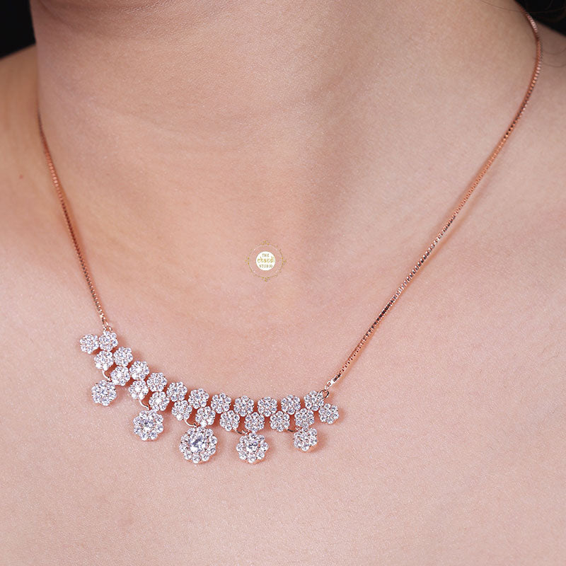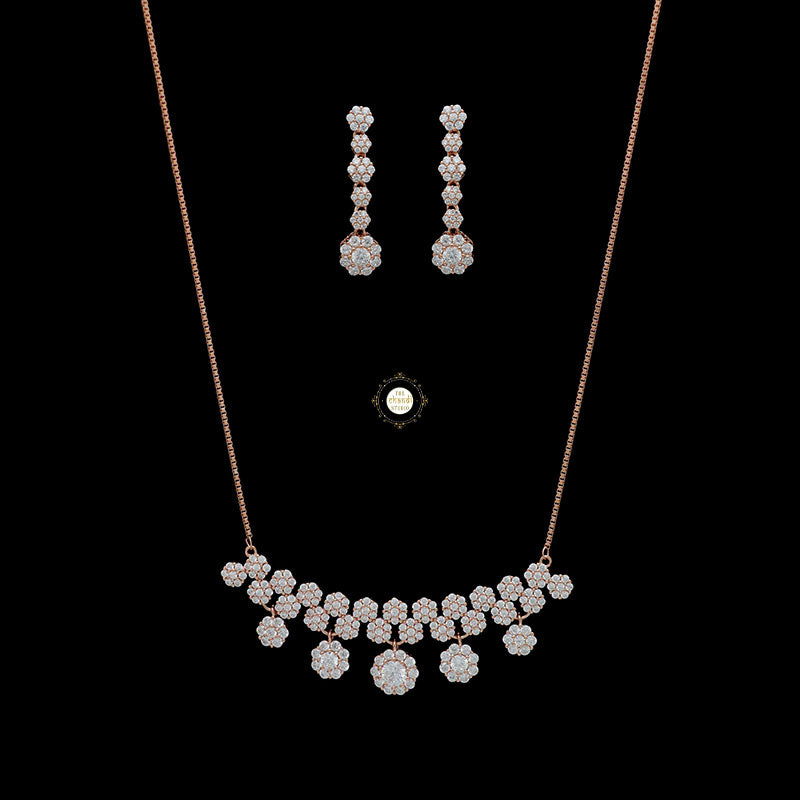 Introducing our ethereal Sparkling Silver Moonlit Necklace with Earrings, a captivating set that captures the magic of moonlit nights. This exquisite ensemble features a stunning necklace and matching earrings adorned with shimmering zircon stones that glow with a celestial allure, reminiscent of moonlit beams. * Nickle free Rhodium Polish for better finish