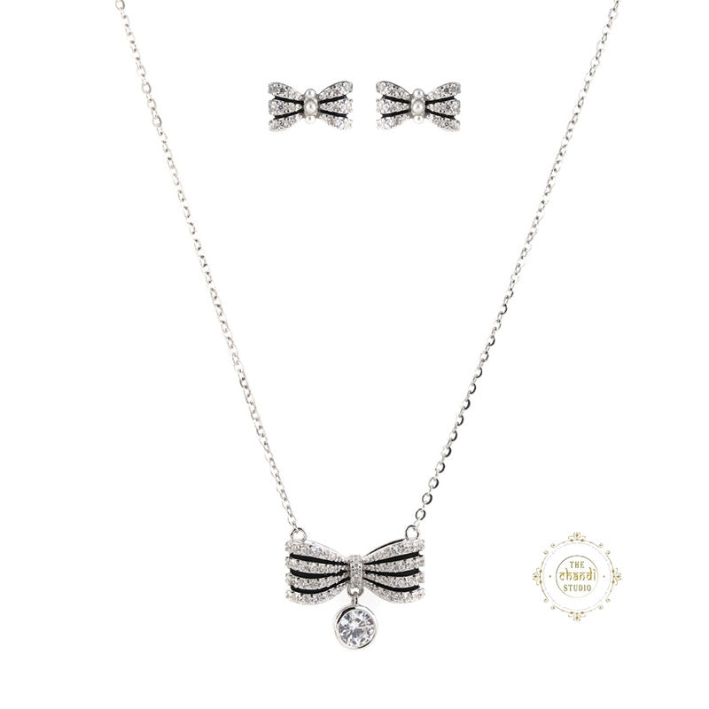 Sparkling Silver Twinkling Bow Necklace with Earring
