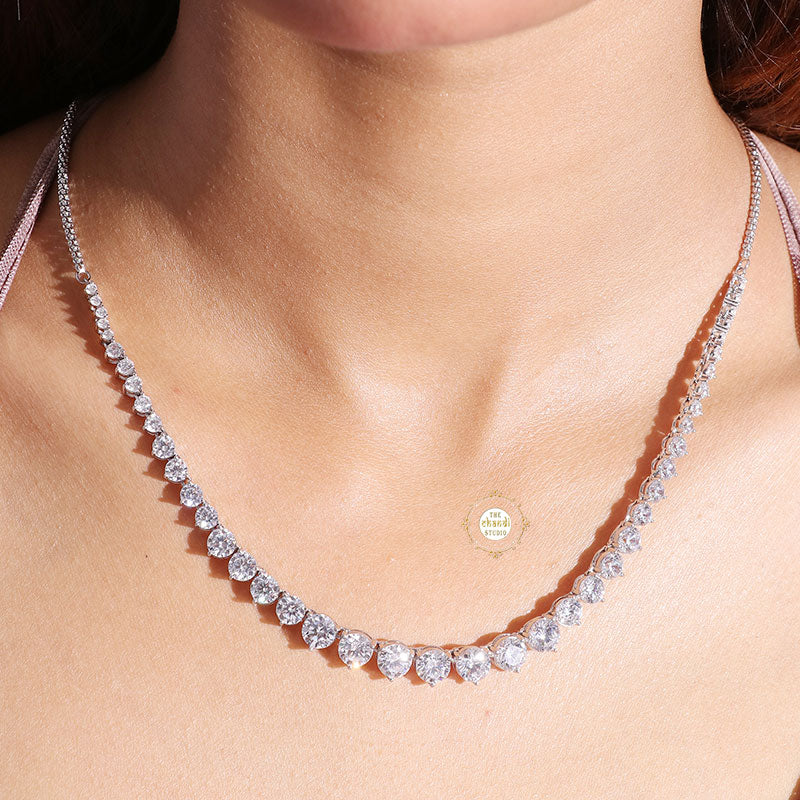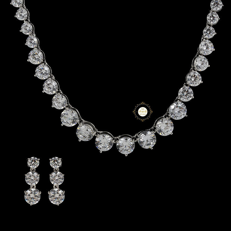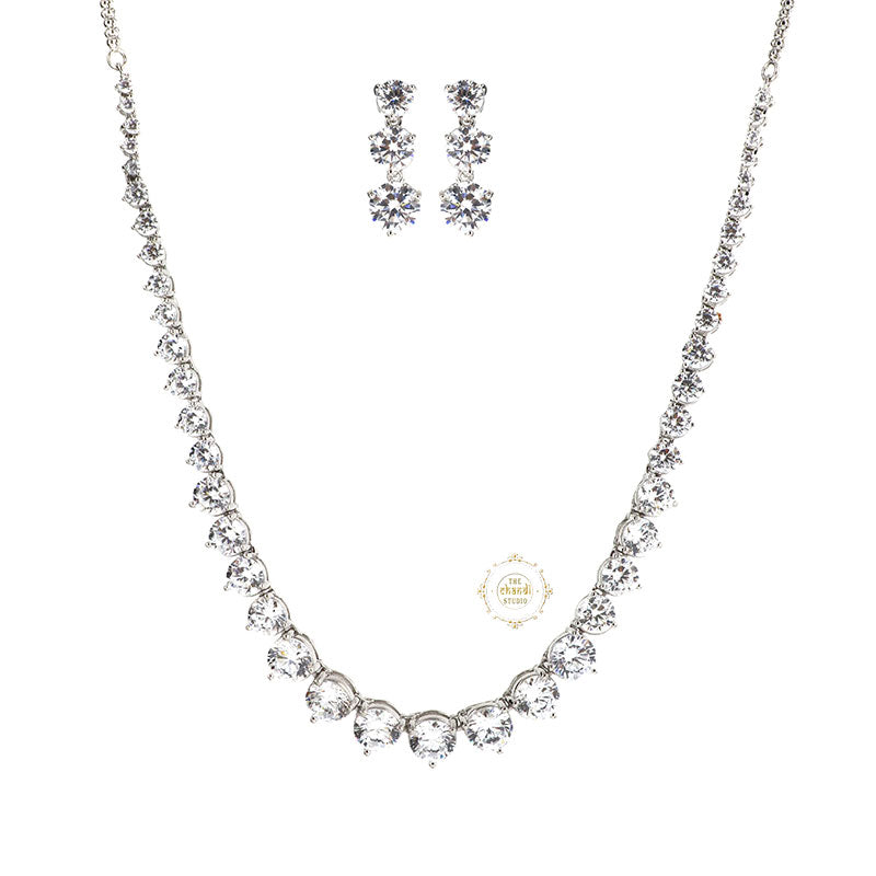 Ward off negativity in style with the Sparkling Silver Zircon Drape Necklace with earring  Crafted in sterling silver with a shimmering evil eye charm, it offers protection and elegance, perfect for everyday wear.