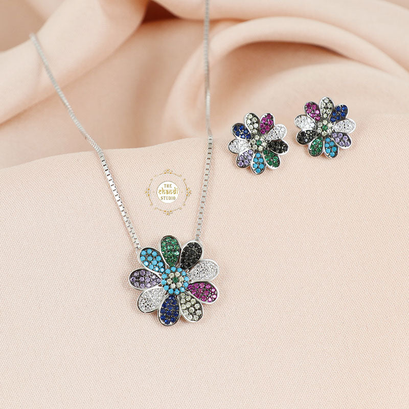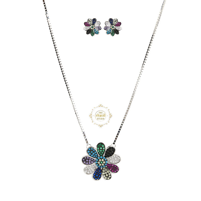 Sparkling Silver Chromatic Petals Necklace with Earring