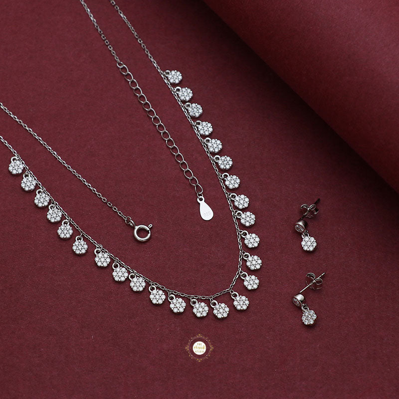 This exquisite necklace features a dazzling design crafted from sparkling silver, adorned with twinkling zircon stones that resemble precious treasures. The intricate detailing and shimmering elements make it a captivating addition to any jewelry collection.