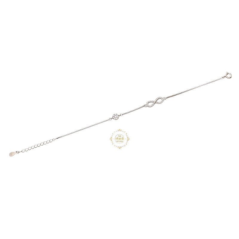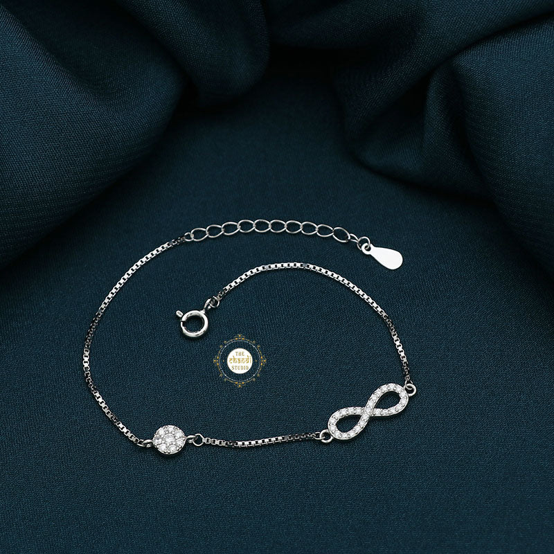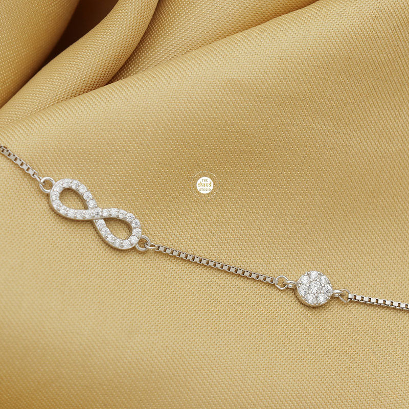 Sparkling Treasure Delicate Infinity Bracelet This sterling silver bracelet is adorned with brilliantly cut sparkling Zircon stones. Manifested on a white toned band, this bracelet is perfect to solidify a union in love for young adults or women who have just started to work on self-love. This pure white hue resonates with the peace of mind that your subconscious mind is attracting The grace of the band bracelet with a unique clustered design on top makes it your instant favourite and insta-worthy piece. Show off your regal essence with this beauty that is unequalled with the other bracelets that you own. Team it up with any attire and be festive ready in a jiffy. Material- 92.5% Sterling Silver Adjustable size Nickle free Rhodium Polish for better finish