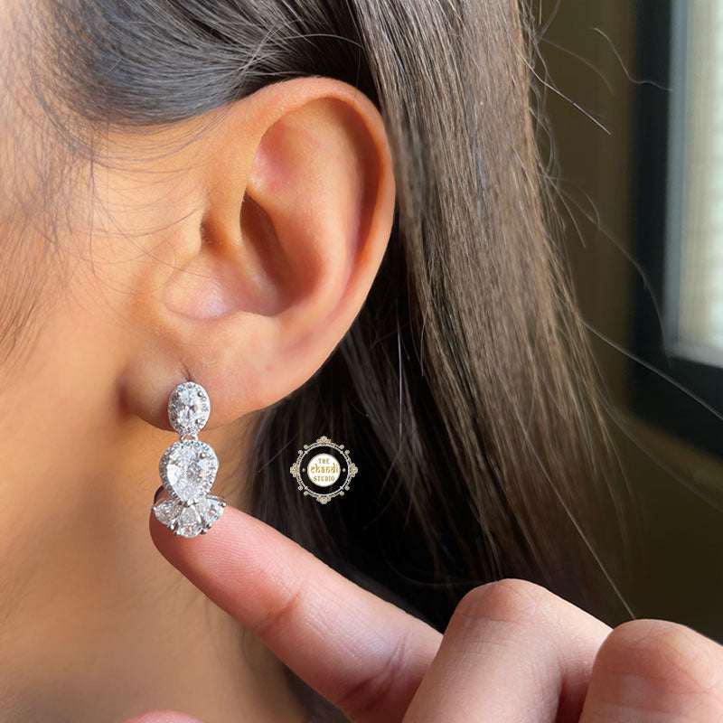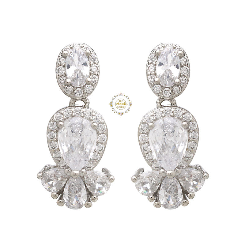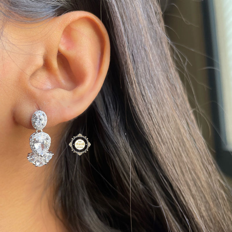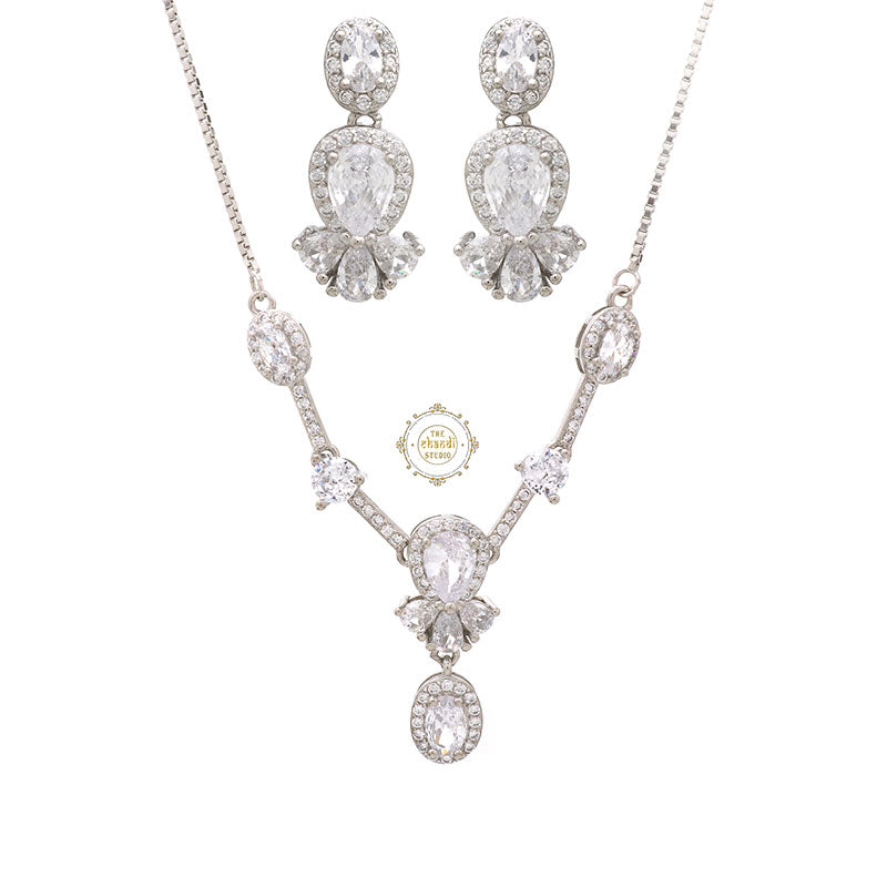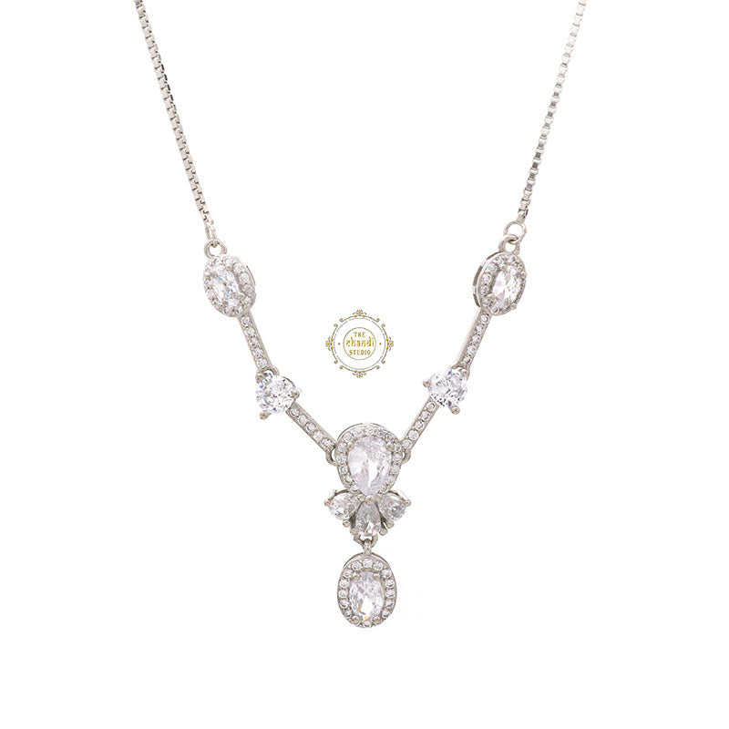This sterling silver necklace set with earring is adorned with brilliantly cut sparkling Zircon stones. This necklace is perfect to solidify a union in love for young adults or women who have just started to work on self-love. This pure white hue resonates with the peace of mind that your subconscious mind is attracting. The grace of the necklace with a unique clustered design on top makes it your instant favorite and insta-worthy piece. Show off your regal essence with this beauty that is unequalled with the other necklace that you own. Team it up with any attire and be festive ready in a jiffy. Material- 92.5% Sterling Silver Nickle free Rhodium Polish for better finish Prices includes Necklace and earrings