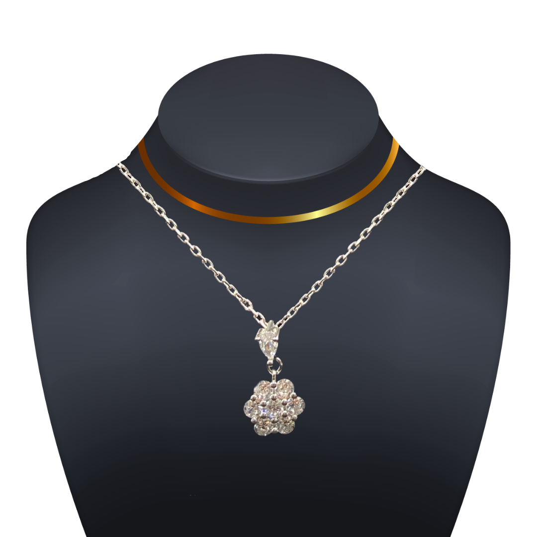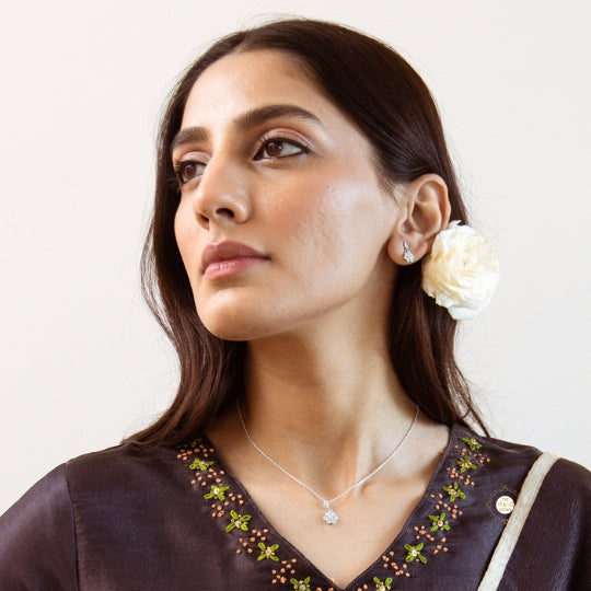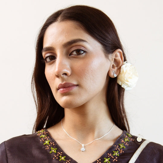 The Sparkling Treasure Floral Necklace Set is an exquisite piece of jewelry that beautifully captures the essence of nature’s elegance. Crafted with meticulous attention to detail, this necklace features delicate leaf-shaped pendants adorned with sparkling cubic zirconia stones. The shimmering leaves gently dangle from a sterling silver chain, creating a graceful and enchanting look. This necklace is a timeless accessory that adds a touch of sophistication and nature-inspired charm to any outfit. Whether worn for a special occasion or as an everyday adornment, it’s a symbol of beauty and grace. Elevate your style with the Sparkling Treasure Leaf Drop Necklace. Material – Sterling Silver 92.5%