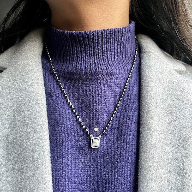 Elevate your post-marital elegance with the exquisite Sparkling Mangalsutra. This stunning neckpiece seamlessly complements any ensemble, ensuring you radiate regal charm at all times. Crafted to perfection, this Mangalsutra effortlessly combines trendiness with timeless style. Whether you’re clad in office formals, traditional attire, or attending a glamorous soirée, this versatile piece is your perfect companion. Designed to be worn around the clock, the Sparkling Mangalsutra is more than just a symbol of marital bliss; it’s a symbol of your enduring grace and fashion-forward sensibility. Add a touch of sparkle to every moment with this exquisite accessory. MATERIAL : STERLING SILVER 92.5