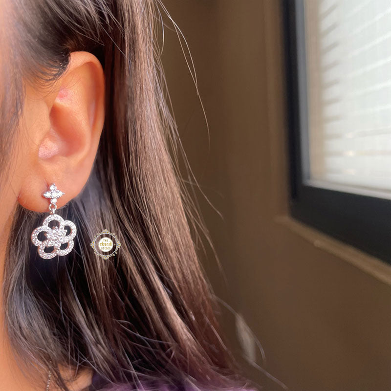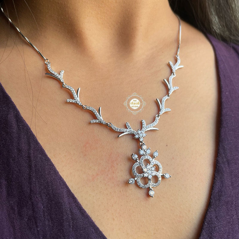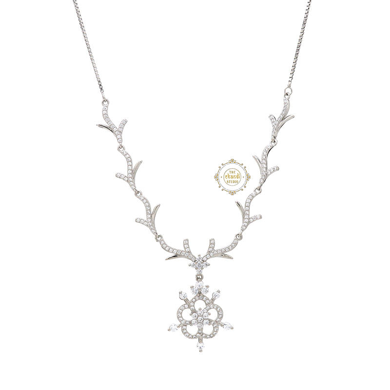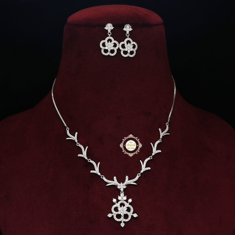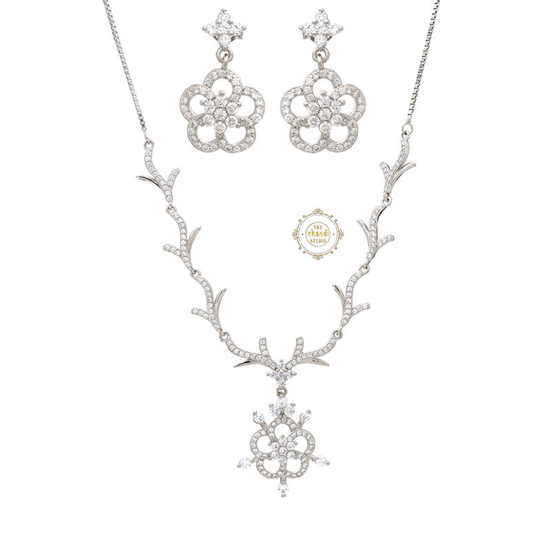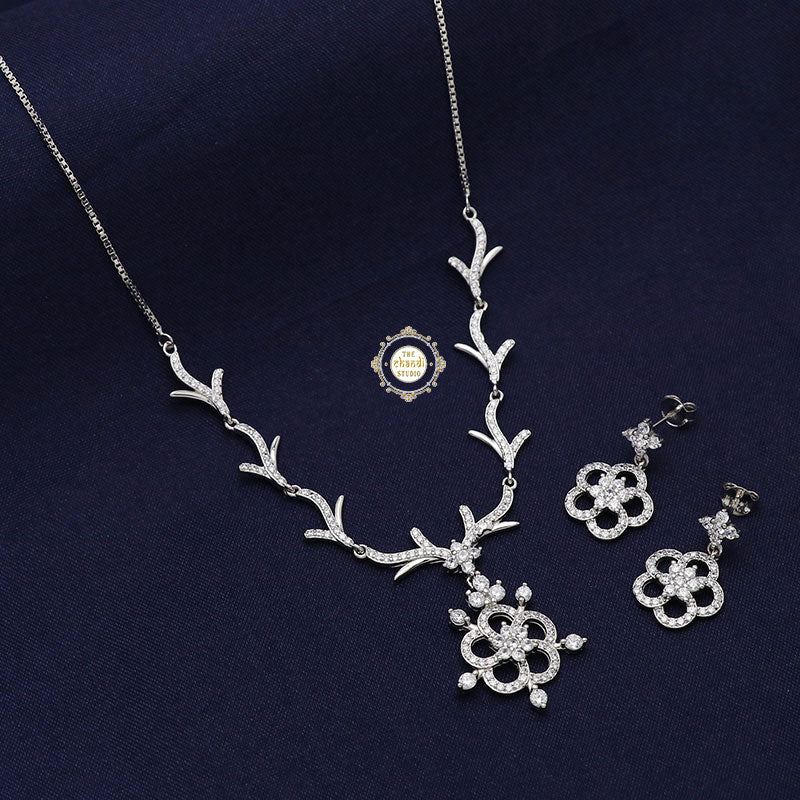 This sterling silver Necklace set with earring is adorned with brilliantly cut sparkling Zircon stones. This necklace is perfect to solidify a union in love for young adults or women who have just started to work on self-love. This pure white hue resonates with the peace of mind that your subconscious mind is attracting The grace of the necklace with a unique clustered design on top makes it your instant favorite and insta-worthy piece. Show off your regal essence with this beauty that is unequalled with the other necklace that you own. Team it up with any attire and be festive ready in a jiffy. Material- 92.5% Sterling Silver Nickle free Rhodium Polish for better finish Prices includes Necklace and earrings