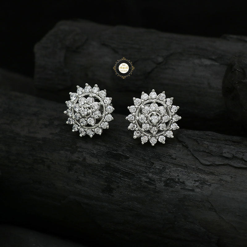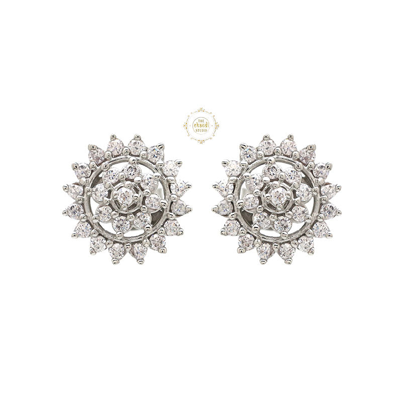 These sterling silver earrings are adorned with brilliantly cut sparkling Zircon stones. Manifested on a white-toned base, these earrings are perfect to enhance the beauty of young and adults who are working on self-love and self-expression. The pure white hue resonates with the peace of mind that your subconscious mind is attracting. The grace of these earrings with a unique clustered design makes them your instant favorite and insta-worthy pieces. Show off your regal essence with this beauty that is unequalled with the other earrings that you own. Pair them with any attire and be ready for any festive occasion in a jiffy. MATERIAL – STERLING SILVER 92.5