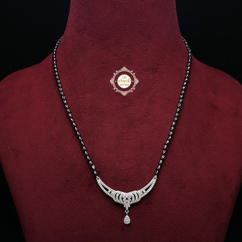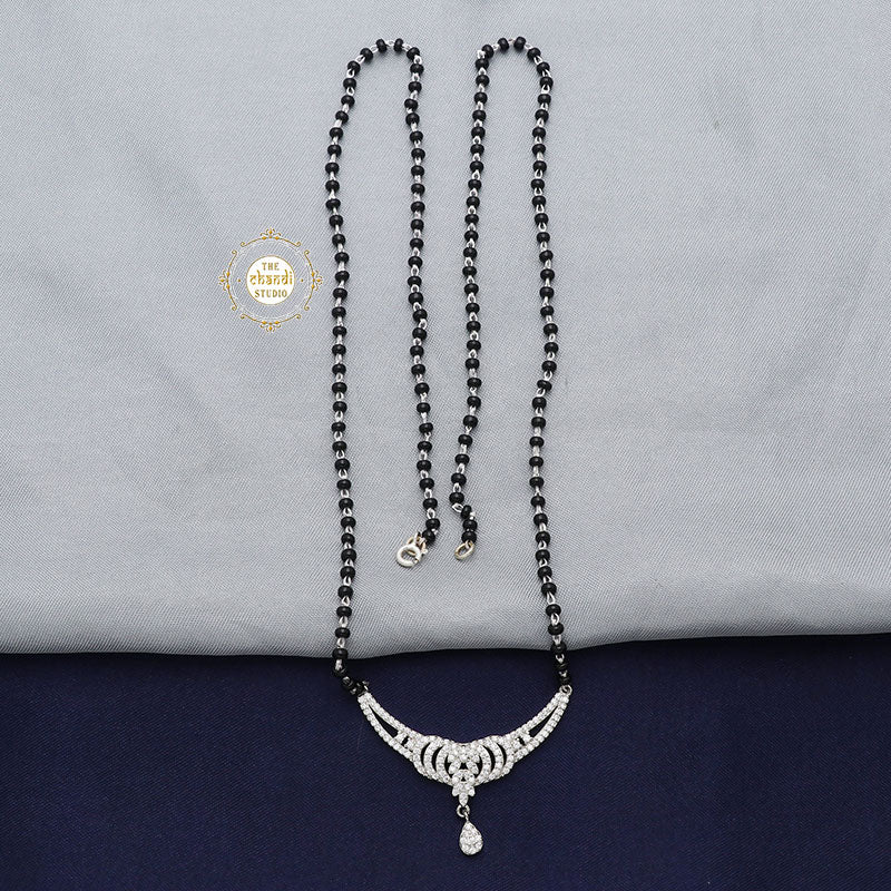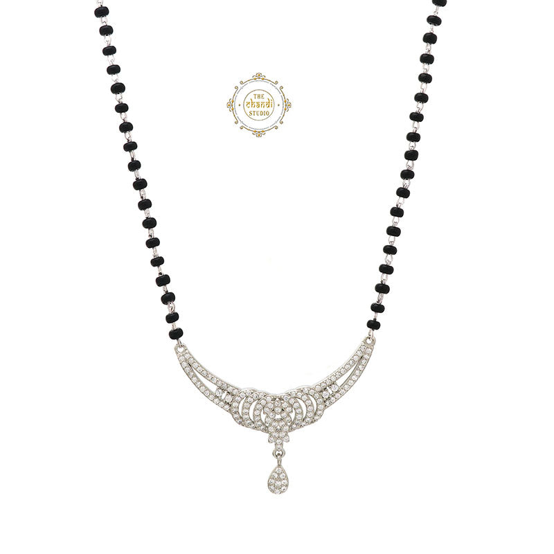 Sport a regal post-marital look by donning this Mangalsutra. This neckpiece just blends effortlessly with all outfits. It’s trendy, it’s stylish & can be worn 24*7 – be it with office formals, traditional attires or parties! MATERIAL : STERLING SILVER 92.5   LENGTH OF CHAIN – 22 inches SIZE OF PENDANT – 3.2 x 4.3 cm