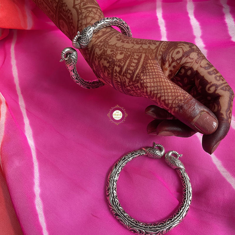 A Statement Piece of Kada with beautiful peacock motifs, intricate chitai work, giving a tribal look to it. Easily fit 2.4' to 2.6' because of its unique Peacock Design Pattern which is twistable. *Price mentioned is for a single piece MATERIAL : STERLING SILVER 92.5