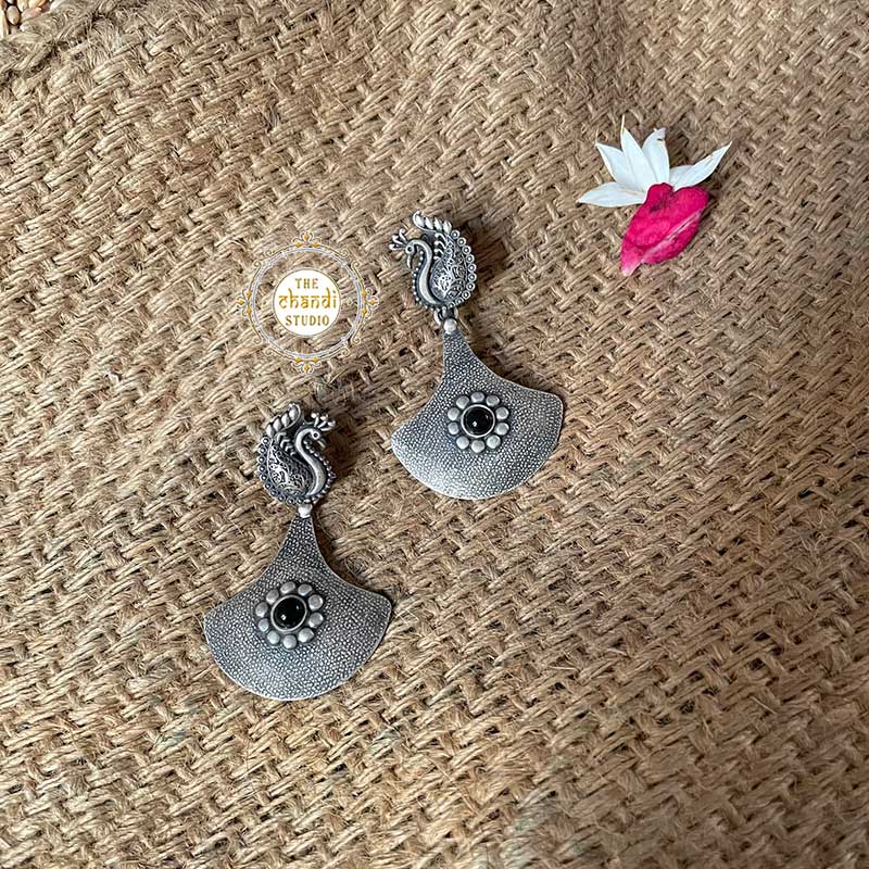 The Sterling Silver Dilkash Peacock Bell Earring features intricate peacock motifs and delicate bell charms. Handcrafted in 92.5 silver, it adds traditional charm and graceful movement to festive looks
