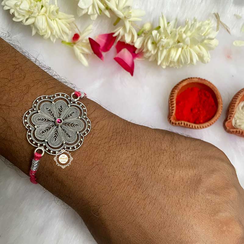 Celebrate the bond of love with the Sterling Silver Floral Grace Rakhi Handcrafted in 92.5 silver, it features an elegant design symbolizing purity, protection, and timeless sibling connection.