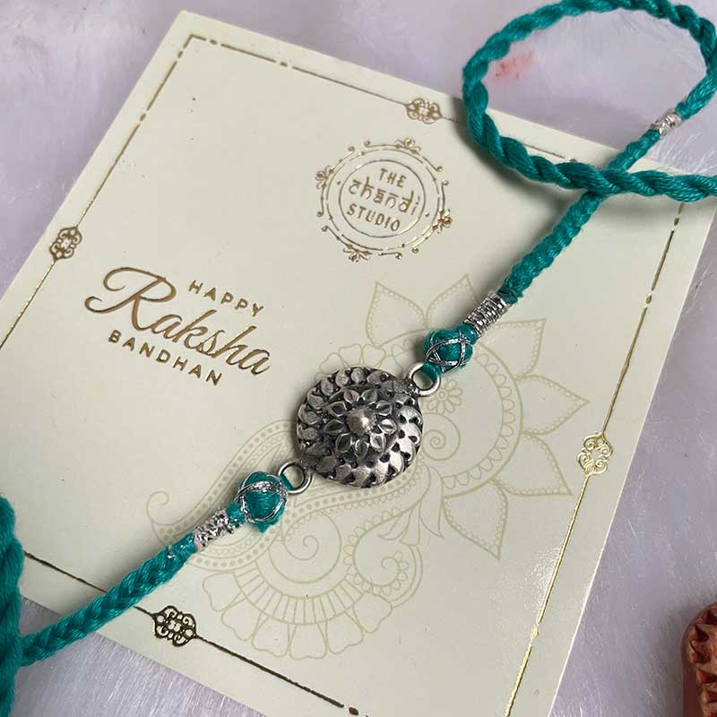 Celebrate the bond of love with the Sterling Silver Floral Grace Rakhi Handcrafted in 92.5 silver, it features an elegant design symbolizing purity, protection, and timeless sibling connection.