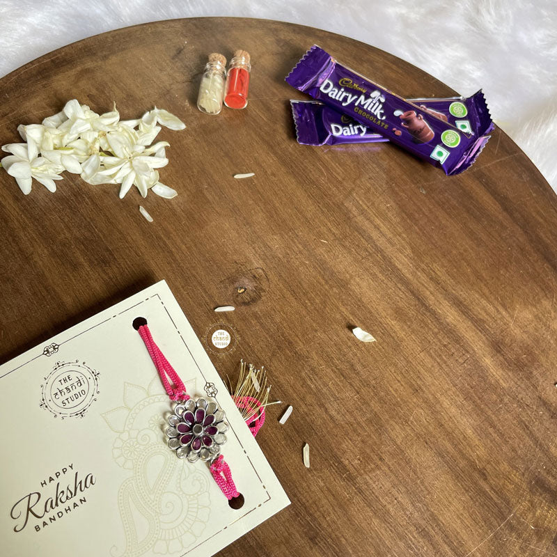 Celebrate the bond of love with the Sterling Silver Floral Grace Rakhi Handcrafted in 92.5 silver, it features an elegant design symbolizing purity, protection, and timeless sibling connection.