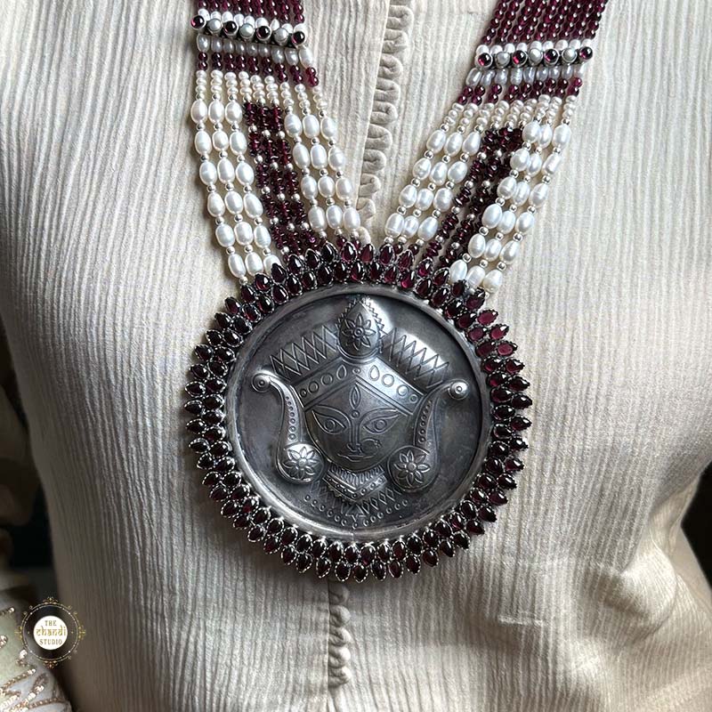 Sterling Silver Hand Carved Ruby Durga Necklace