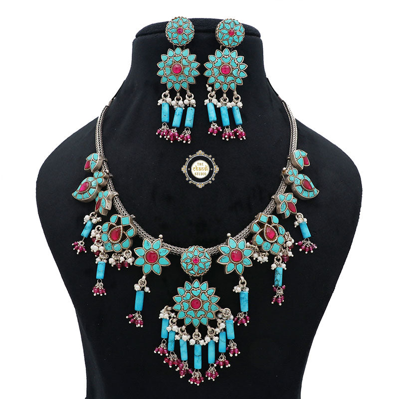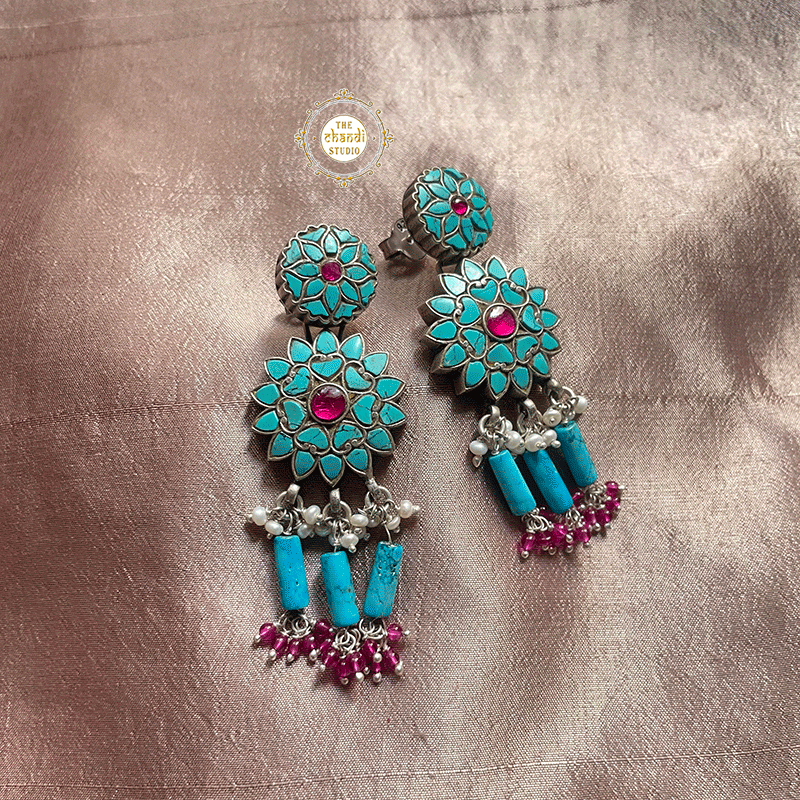 Dual combinations work finely on everything, be it dress, ice-creams or ornaments. Precious stones like ruby and turquoise are rare and beautiful. Hence they make the perfect partner for necklaces. The turquoise- ruby duo is magnificent and appealing, so they’re put together in this precious ranihaar that emphasizes Indian culture. It pairs well with western and especially with Indian outfits. Earring : Length - 6.5 cm | Width - 2.5 cm *Price is inclusive of  the earrings. MATERIAL : STERLING SILVER 92.5