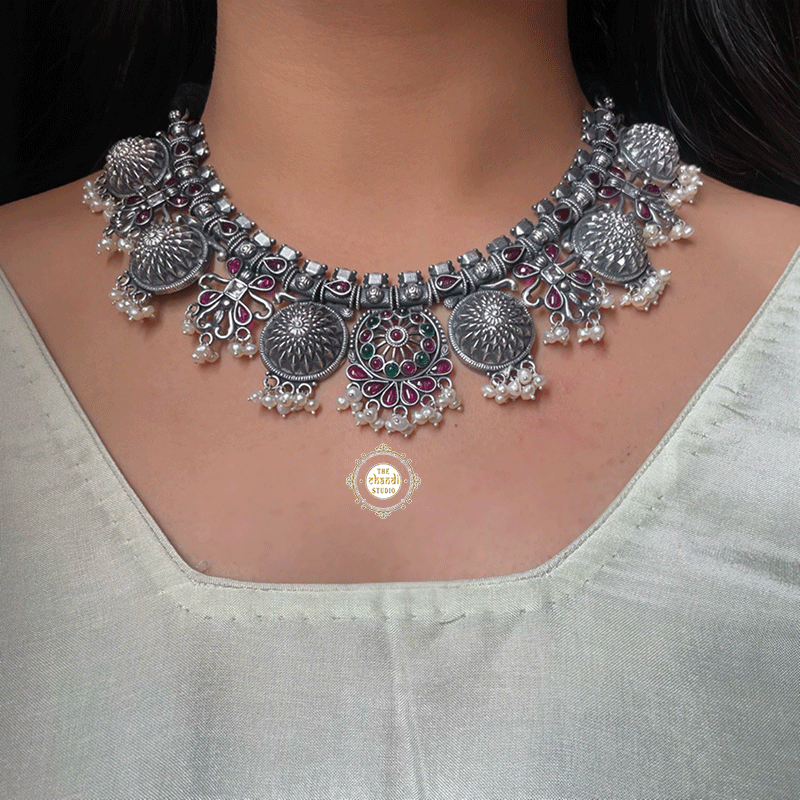 Feel the power of divinity and elegance with this mythologically inspired modern piece of art that adorns your neckline. The romantic rubies and pearls around the Kolapuri Necklace gives a contrasting effect that looks like a work of art in itself. Jewelry has the power to be this one little thing that can make you feel unique. Goes perfectly well with your Indian and Ethnic dresses. MATERIAL : STERLING SILVER 92.5 Earring : Length - 4.4 cm | Width - 2.5 cm *Price is inclusive of  the earrings.