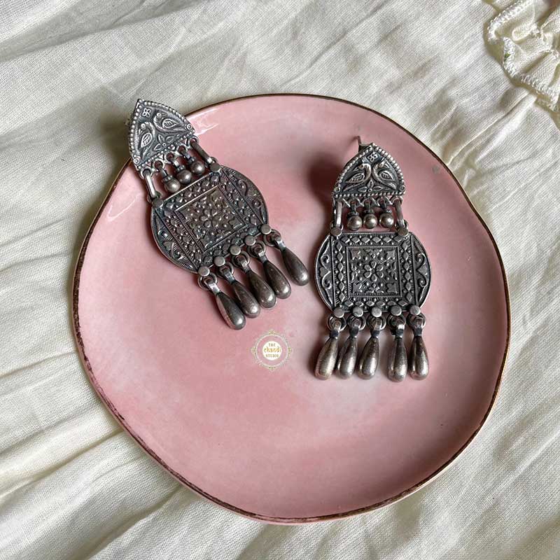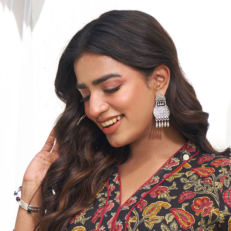 As beautiful as the chandeliers in her room and as elegant as her words of wisdom, the mother gifted her daughter - a pair of earrings made of white lustrous metal. Malleable, ductile and shiny, silvers have always been the daughter's favourite and mother's best-loved. Dusky, earthy and warm or Beige, heavenly and cool - this classic 'Noor Intricate Timeless Earring' is for generations of women in love with themselves and their battle scars. This earring is painstakingly designed with intricate ancient patterns and cute danglers that will frame your face beautifully. An understated piece of jewelry that caters to your dynamic ethnic closet. MATERIAL : STERLING SILVER 92.5