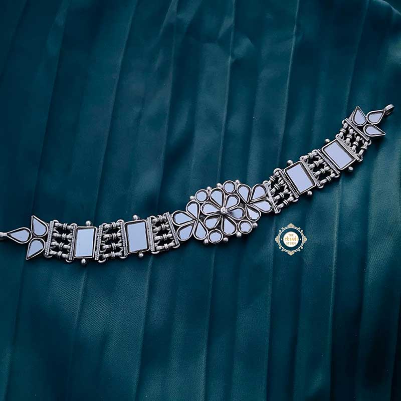 The Sterling Silver Soulful Sheesha Rajwada Choker embodies royal elegance with handcrafted mirror work, 92.5 silver purity, and timeless Rajwada artistry — perfect for festive, bridal, and statement ethnic looks.