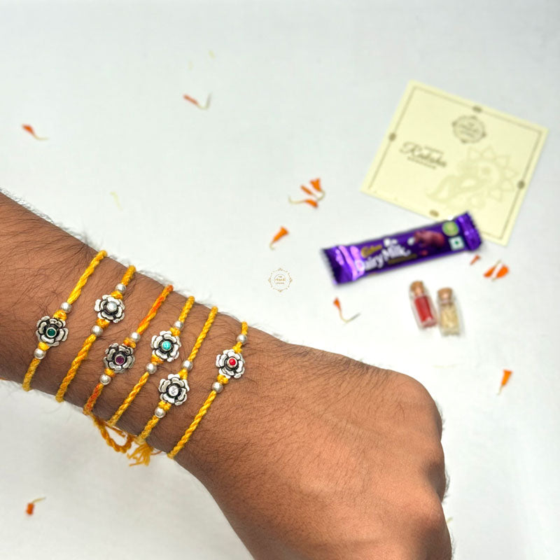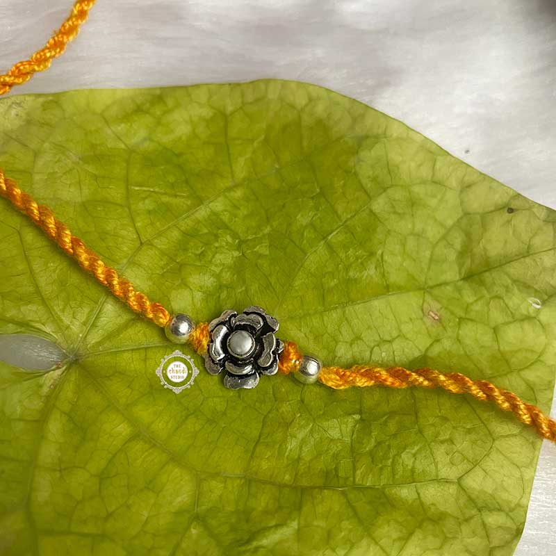 Celebrate the bond of love with the Sterling Silver Floral Grace Rakhi Handcrafted in 92.5 silver, it features an elegant design symbolizing purity, protection, and timeless sibling connection.