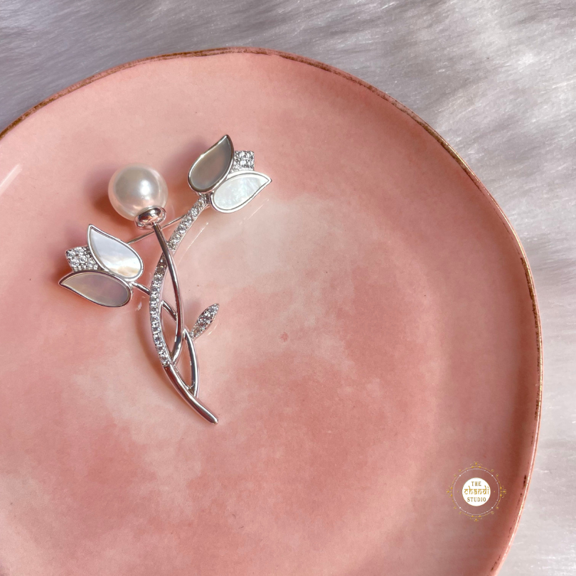 This stunning accessory features a delicate lotus design, beautifully crafted in shimmering silver and adorned with lustrous pearls.