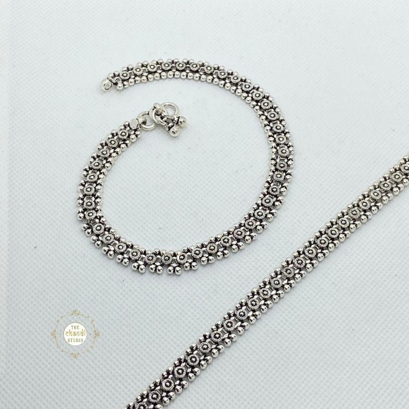 The Silver Blossom Anklet is a beautiful blend of elegance and charm. Crafted from sterling silver, it features intricate floral designs, making it a perfect accessory to elevate any look.