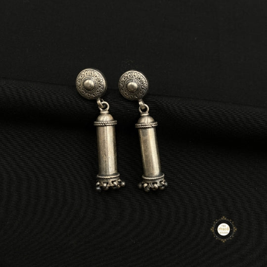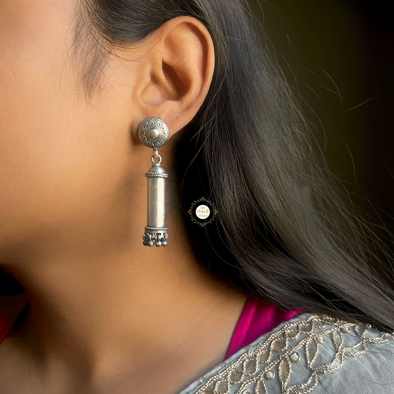 The Heritage Pillar Drop Earring showcases a striking pillar-inspired design, crafted in sterling silver with intricate detailing. Perfect for cultural events or special occasions, these earrings add a touch of vintage elegance. Dimension : L-5.6 cm W-1.4 cm
