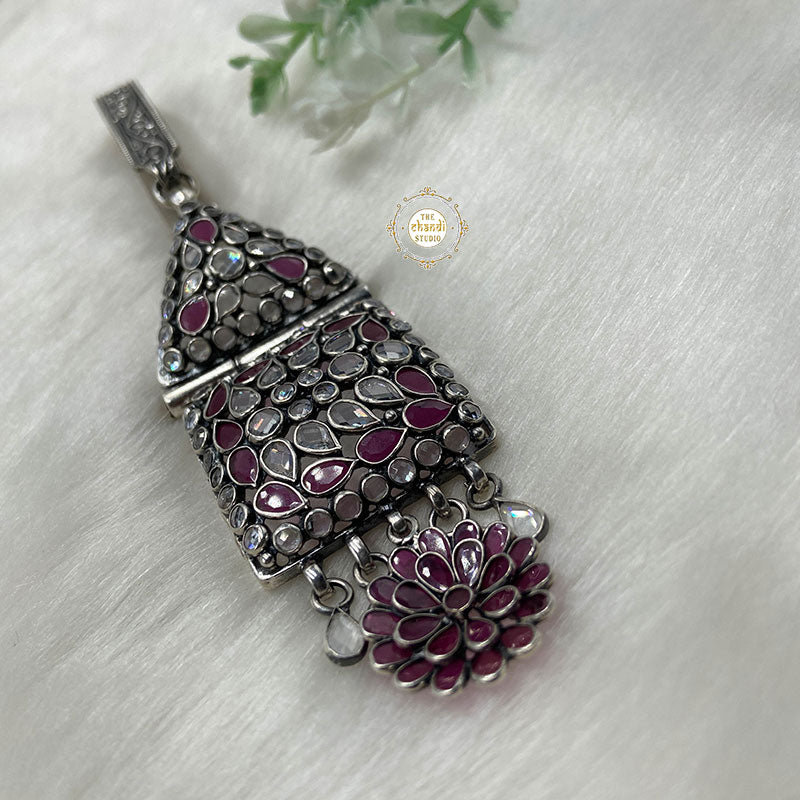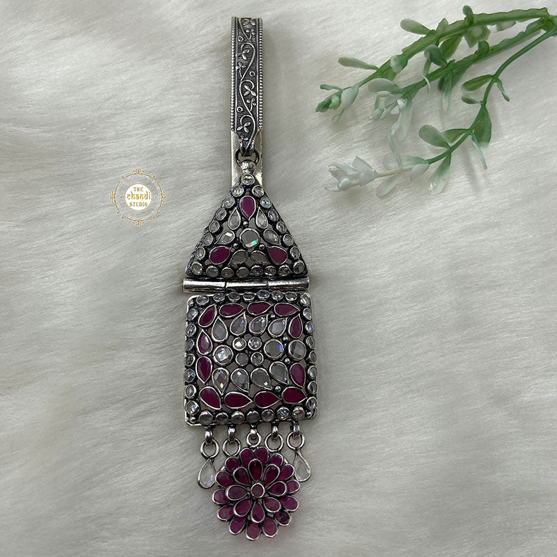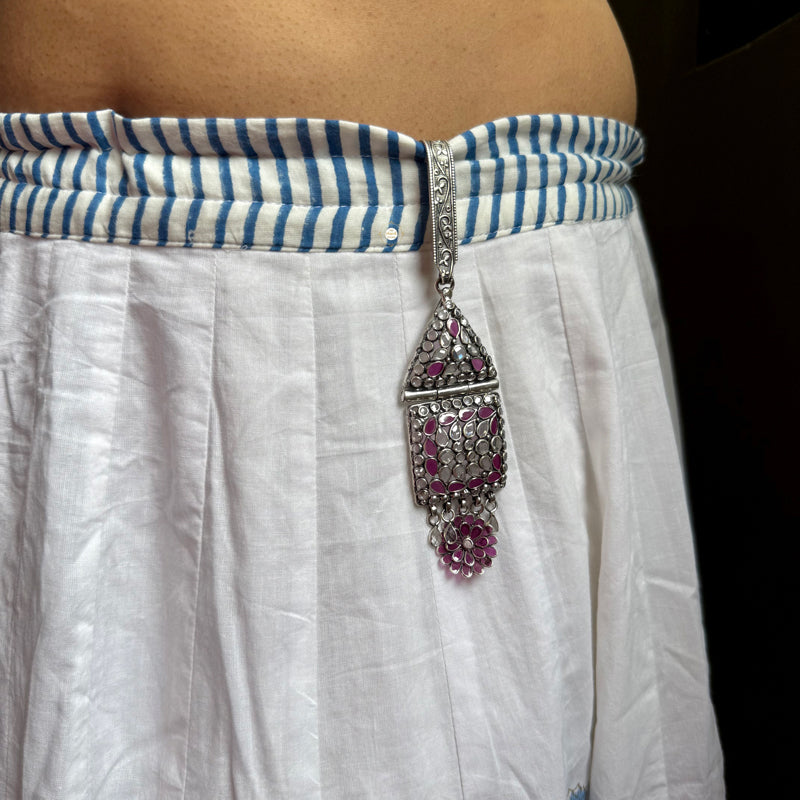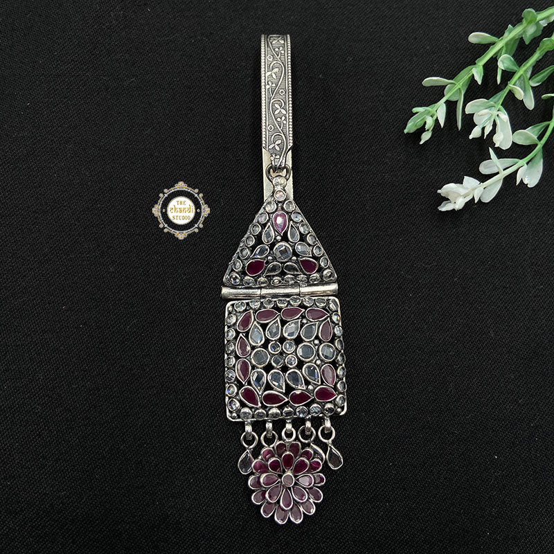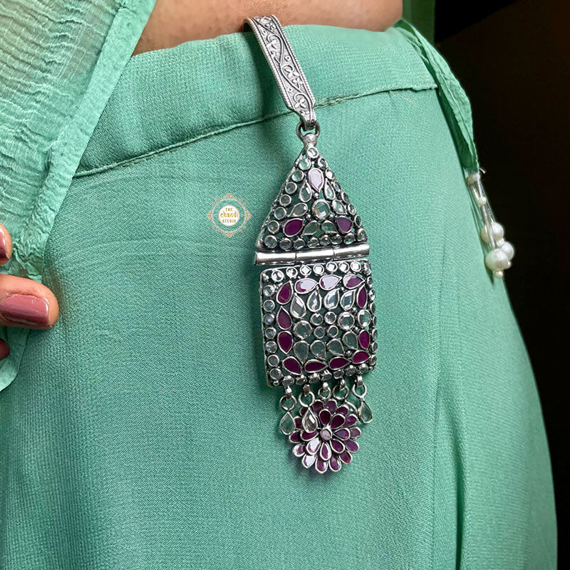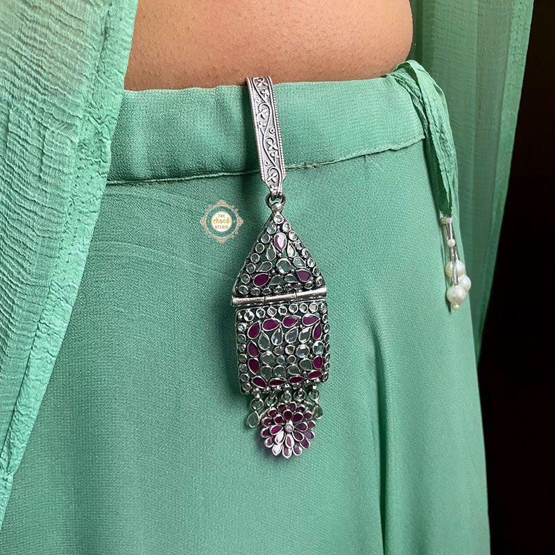 Inspired from the remembrances of childhood, at Chandi Studio we recreated a beautiful mix of timelessness and charm in the form of Timeless Floral Glass Satka to add unmatched elegance and character to your attire without losing the element of convenience and tap into this antique trend the next time you’re wearing a saree to a festive occasion. Simply tuck it into your saree or hang it on your purse, it is an ideal accessory when you want to make your style evident without being too obvious or gift it to your loved ones to make their occasion more special.   MATERIAL : STERLING SILVER 92.5