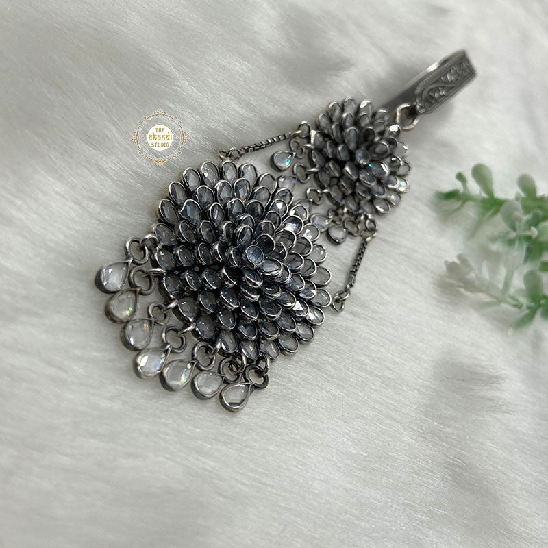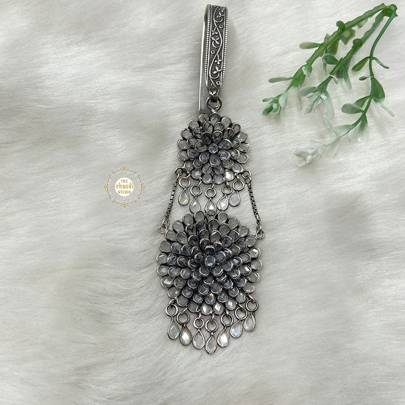 Inspired from the remembrances of childhood, at Chandi Studio we recreated a beautiful mix of timelessness and charm in the form of Timeless Floral Glass Satka to add unmatched elegance and character to your attire without losing the element of convenience and tap into this antique trend the next time you’re wearing a saree to a festive occasion. Simply tuck it into your saree or hang it on your purse, it is an ideal accessory when you want to make your style evident without being too obvious or gift it to your loved ones to make their occasion more special.   MATERIAL : STERLING SILVER 92.5