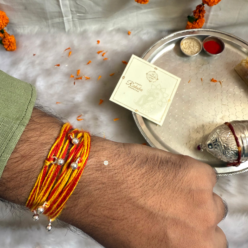 Celebrate the bond of love with the Sterling Silver Floral Grace Rakhi Handcrafted in 92.5 silver, it features an elegant design symbolizing purity, protection, and timeless sibling connection.