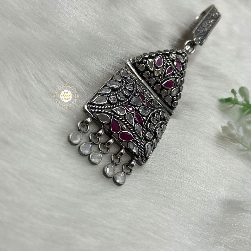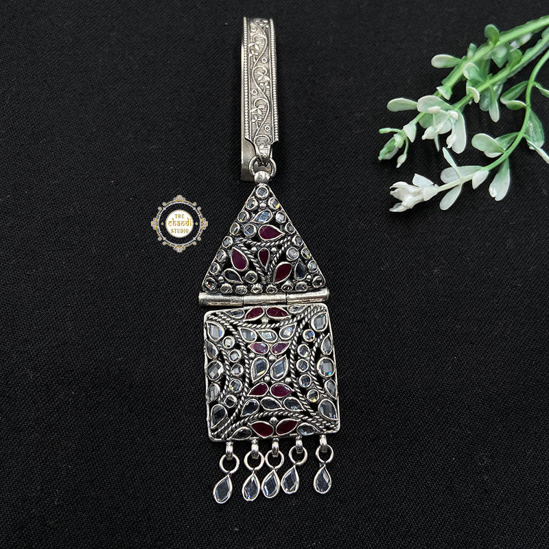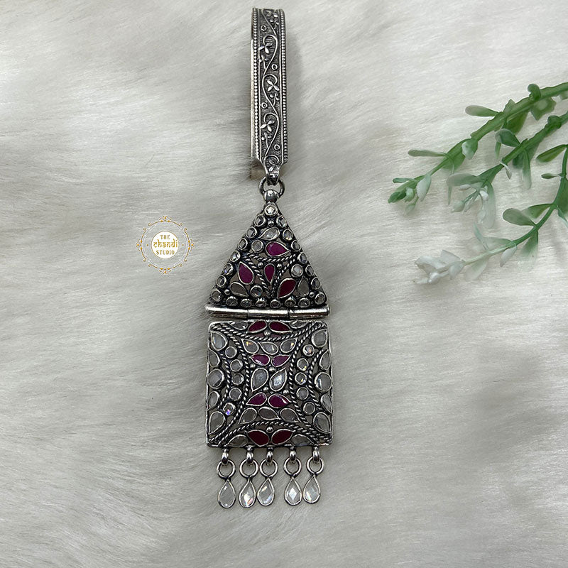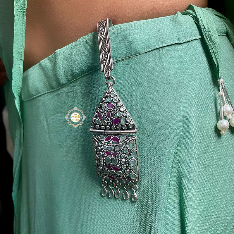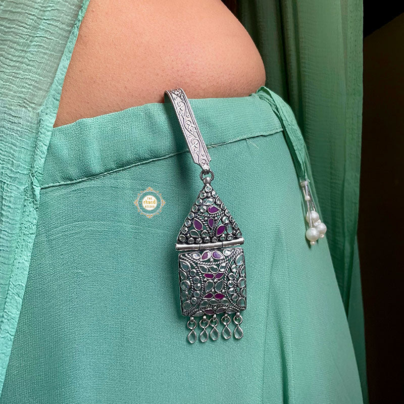 Inspired from the remembrances of childhood, at Chandi Studio we recreated a beautiful mix of timelessness and charm in the form of Timeless Minimal Satka to add unmatched elegance and character to your attire without losing the element of convenience and tap into this antique trend the next time you’re wearing a saree to a festive occasion. Simply tuck it into your saree or hang it on your purse, it is an ideal accessory when you want to make your style evident without being too obvious or gift it to your loved ones to make their occasion more special.   MATERIAL : STERLING SILVER 92.5