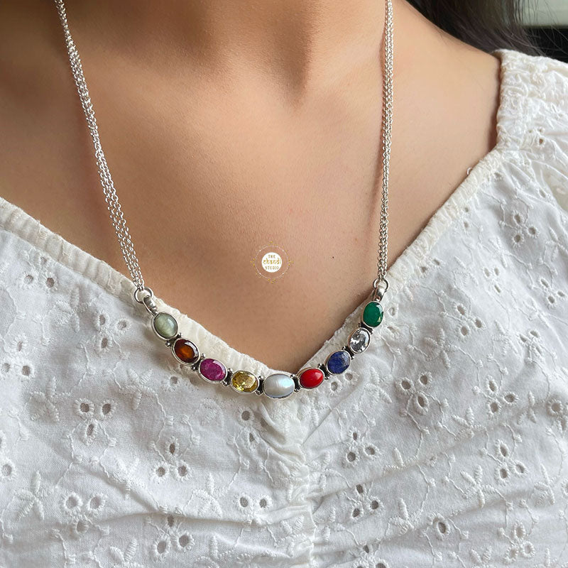 The intricate design of this necklace exudes a timeless charm, showcasing a symphony of vibrant gemstones including ruby, pearl, coral, emerald, yellow sapphire, diamond, blue sapphire, hessonite, and cat’s eye. Each gem is meticulously selected and set to accentuate the allure and beauty of this masterpiece. Embrace the essence of luxury and tradition embodied in this Timeless Navratna Necklace, an embodiment of grace, style, and profound symbolism. * Material : Sterling Silver 92.5% * Length of Chain – 20 inch
