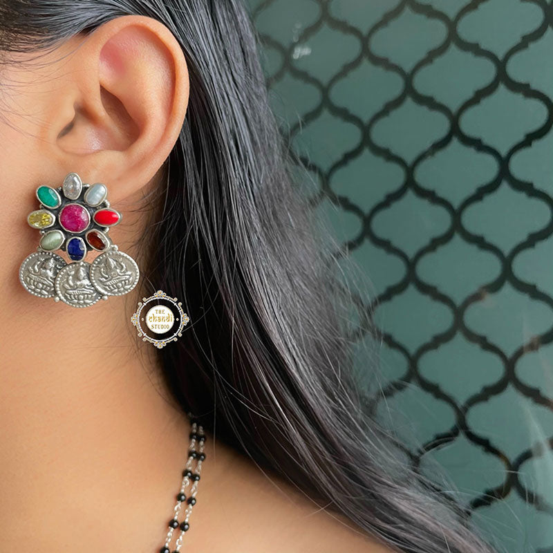 Navaratna is a Sanskrit compound word meaning "nine gems" or "ratnas". We have brought this amazing range of Navratna products that are versatile and goes with all kind of attire. This earring is crafted by hand with a pure intention of generating positivity in these tough times. Wear the statement jewelries from this collection and get some Instagram worthy selfies and photos. Ethnic outfits, off-shoulder blouses, embroidered skirts, cotton salwars and silk sarees - be the best dressed, everyday. MATERIAL : STERLING SILVER 92.5