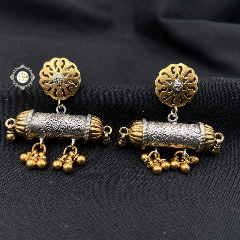 Tribal Taweez Earring Dual Tone   The intricacy of Tribal Jewelry is always known to bring a definite earthy charm to its holder. Tribal earrings from our studio are solely inspired by the prominent Indian mythological symbol ‘taweez’ which is believed to shield the wearer from evil spirits, in addition to their aesthetic value. These rare Tribal Taweez Earrings are handcrafted precisely from silver with an oxidized finish and festooned with cute tiny danglers. Pair these earrings up with a plain saree or simple crop top with a skirt for any conventional event. You will surely turn some heads at your friend’s bridal shower with this radiant and fresh look. MATERIAL : STERLING SILVER 92.5