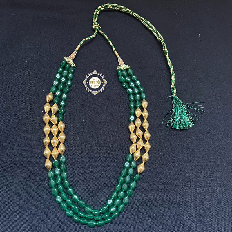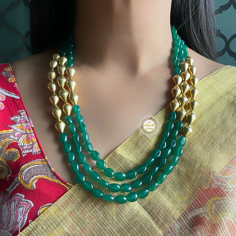 Trio Strand Dholki Bead Gold Necklace (Green)
