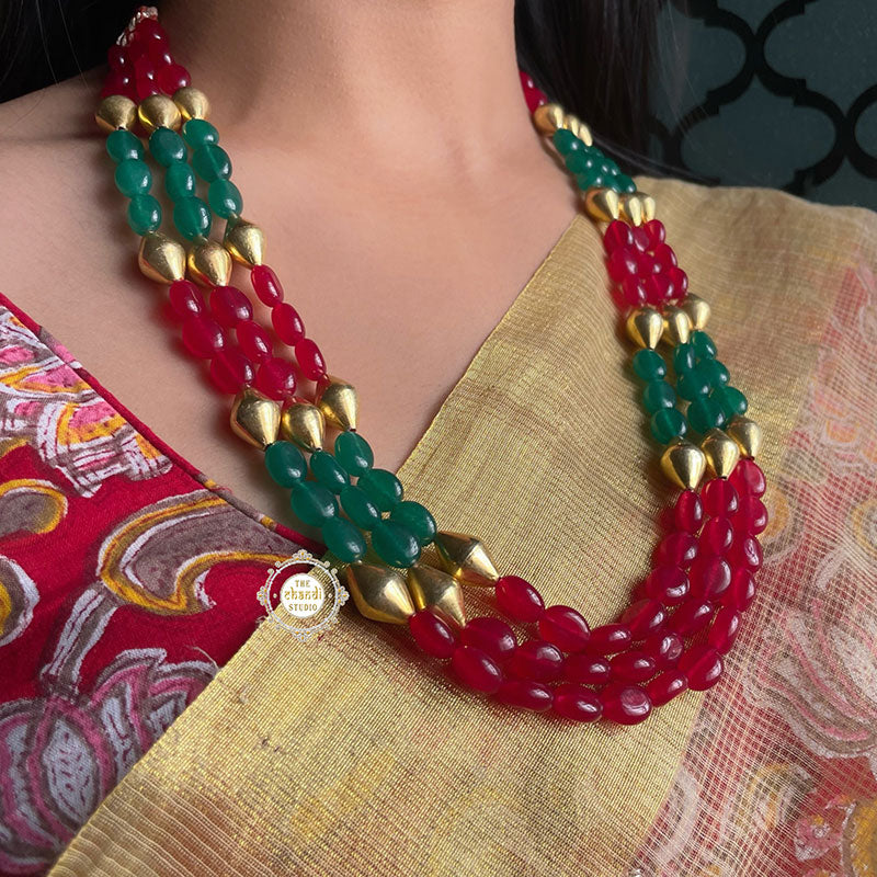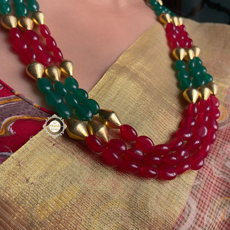 Trio Strand Dholki Bead Gold Necklace (Multi-Color)