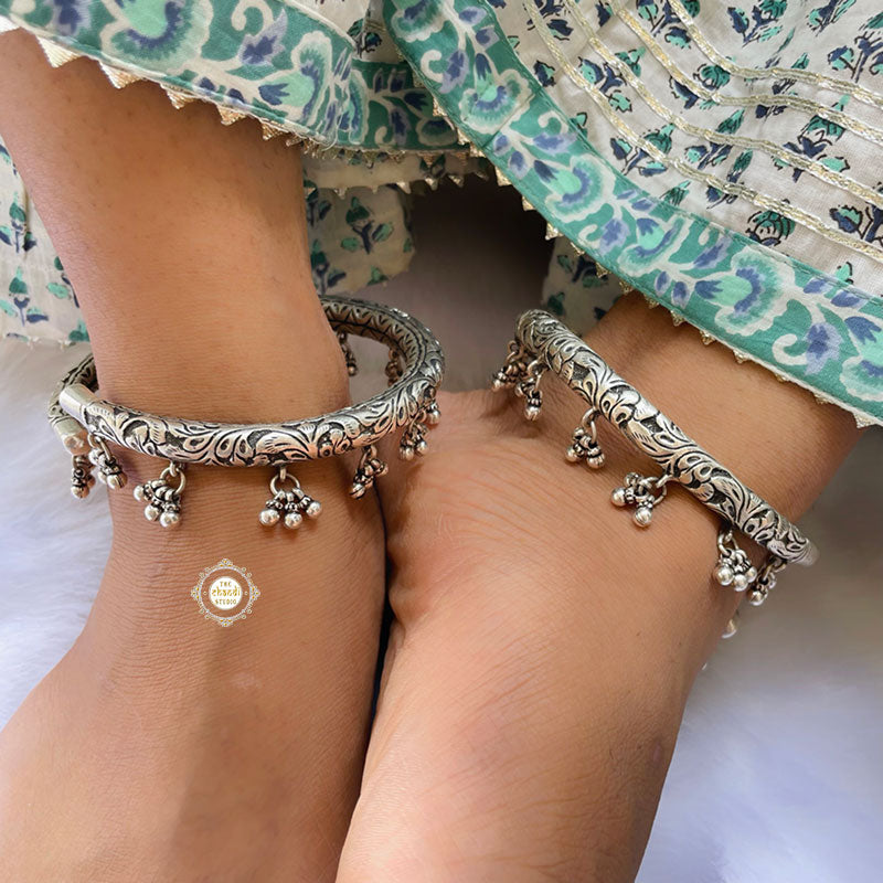 Utsav Chitai Ghungroo Leg Kada is a traditional Indian ankle accessory. There is always a different kind of attraction in things that are sonorous. Inspired by the ancient kadas worn by women to adore their feet, these beautifully carved anklet kadas are manifested in silver to give their hardworking feet a regal touch with colors of elegance. The ghungroo produces a sweet sound amidst the humdrum of the monotonous life. The mesmerizing memories of going through the festivities in this kadas will always make you like them, a bit more. And smile a lot more. MATERIAL : STERLING SILVER 92.5