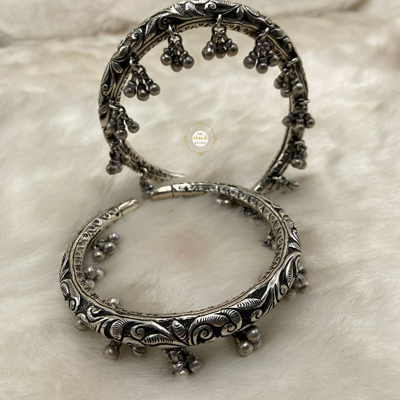 Utsav Chitai Ghurgroo Leg Kada There is always a different kind of attraction in things that are sonorous. Inspired by the ancient kadas worn by women to adore their feet, these beautifully carved anklet kadas are manifested in silver to give their hardworking feet a regal touch with colors of elegance. The ghungroo produces a sweet sound amidst the humdrum of the monotonous life. The mesmerizing memories of going through the festivities in this kadas will always make you like them, a bit more. And smile a lot more. MATERIAL : STERLING SILVER 92.5