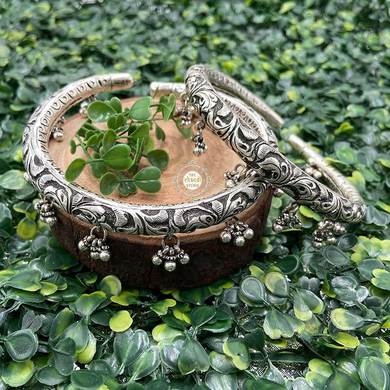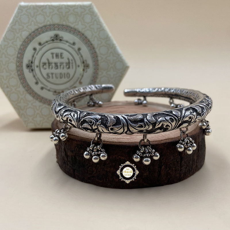 Utsav Chitai Ghurgroo Leg Kada There is always a different kind of attraction in things that are sonorous. Inspired by the ancient kadas worn by women to adore their feet, these beautifully carved anklet kadas are manifested in silver to give their hardworking feet a regal touch with colors of elegance. The ghungroo produces a sweet sound amidst the humdrum of the monotonous life. The mesmerizing memories of going through the festivities in this kadas will always make you like them, a bit more. And smile a lot more. MATERIAL : STERLING SILVER 92.5