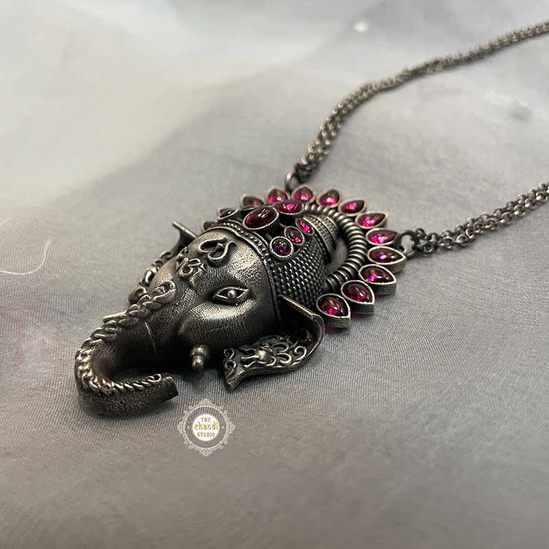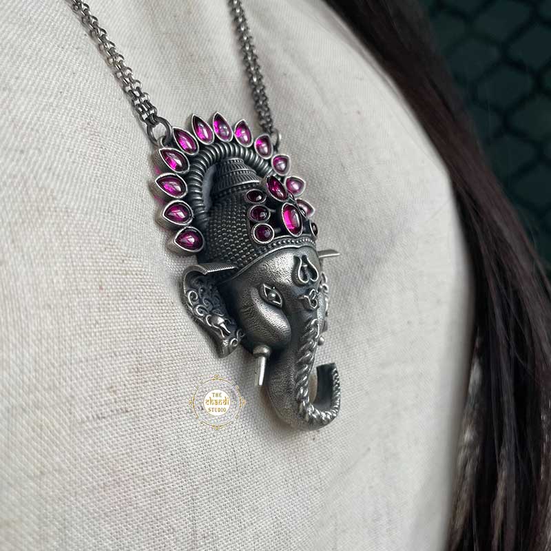 Vignharta takes away all our anxieties, apprehensions, pains and problems. Inspired from the Lord Ganesha, this neckpiece was hand crafted with lot of patience, creativity and innovation. Remover of all obstacles and sufferings, the Ganesh-themed necklace named Utsav Ganesha Necklace will keep your mind calm, and soul calmer. The sleek chain with an intricately carved pendant is ideal for everyday wear as well as day festivities. This is the piece that is traditional, trending and tops the fashion sense in your everyday life. Pendant Length – 7 CM Width – 4 CM Chain – 22 Inch MATERIAL - STERLING SILVER 92.5%