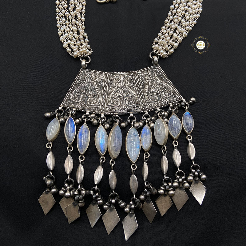 Utsav Peacock Ghungroo Necklace, a masterpiece of traditional Indian craftsmanship. Handmade by skilled artisans, this necklace features an exquisite peacock motif, symbolizing grace and beauty. Adorned with delicate ghungroo bells, it emits a melodious sound with movement. A blend of tradition and elegance, it's perfect for cultural events, weddings, or special occasions. Celebrate Indian heritage with this timeless jewelry. * Material – Sterling Silver 925 Chain Length 22 inch +1 inch extension pendent Length 5 inch Width 4 inch