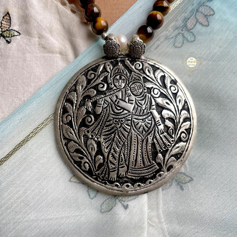 Discover the essence of divine love and timeless artistry with The Chandi Studio's Utsav Radha-Krishna Necklace. This exquisite Necklace, meticulously handcrafted in the renowned Chitai region, captures the eternal love story of Radha and Krishna. Its delicate beauty and intricate design are a tribute to centuries-old traditions, making it a piece to cherish. Adorn yourself in the grace of divine love and craftsmanship that transcends time.   Our Chitai Radha-Krishna Necklace features a chain hand-strung with semi-precious stones, chosen not just for their aesthetics but also their positive energies. These stones add a touch of opulence and balance to your life. Experience the harmonizing energies and exquisite craftsmanship with every wear. Elevate your style and spirituality with The Chandi Studio's Chitai Radha-Krishna Necklace.   * MATERIAL : STERLING SILVER 92.5