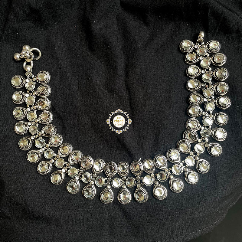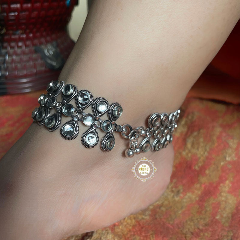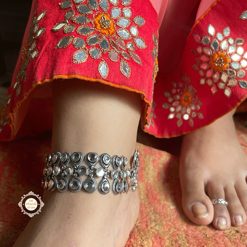 The anklet is a piece of jewelry that is very vital for Indian women. Even today, this ancestral piece has not lost its shine and grace. Our Versatile Kundan Anklet Pair has been set flawlessly in the silver case to not just add a traditional vibe to your apparel but also to help your lovely feet stand out. The royalty that Kundan displays have been captured perfectly in these anklets which can be paired with your Heavy work Lehengas or Designer Sarees. These can be adorned by the bride as well as the bridesmaids during an event of wedlock or an engagement. L - 10.5 inch, W - 1 inch * Price mentioned is for a Pair. * Material – Sterling Silver 925
