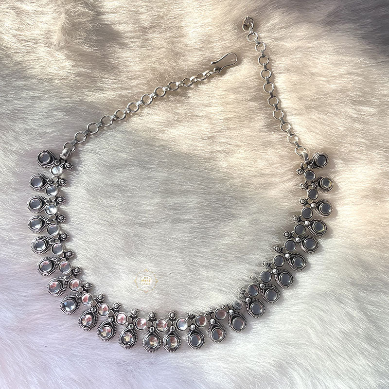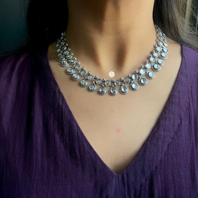 Designed with sparkling pure silver, this Versatile Kundan Necklace goes best with deep neck outfits. Flaunt your collarbone and cheerful smile! LENGTH - 17 inches